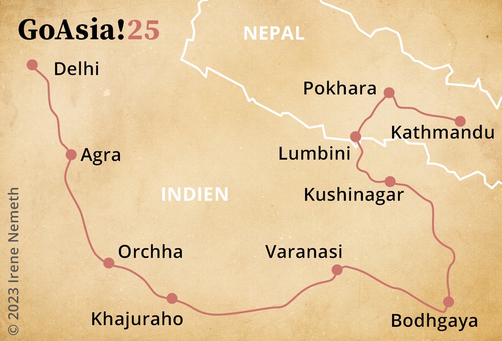 Über 2100 Kilometer führt die neunte GoAsia! von Delhi nach Kathmandu am Fuße der Achttausender. Diese Strecke werden wir innerhalb von drei Wochen ausschließlich mit öffentlichen Verkehrsmitteln zurück legen. Maximal acht Kilo Gepäck, der Verzicht auf Komfort und eine nur rudimentäre Planung machen die Reise zu einem unvergesslichen Abenteuer.